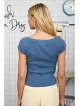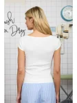 Washed Boat Neck Short Sleeve Ribbed Knit Top